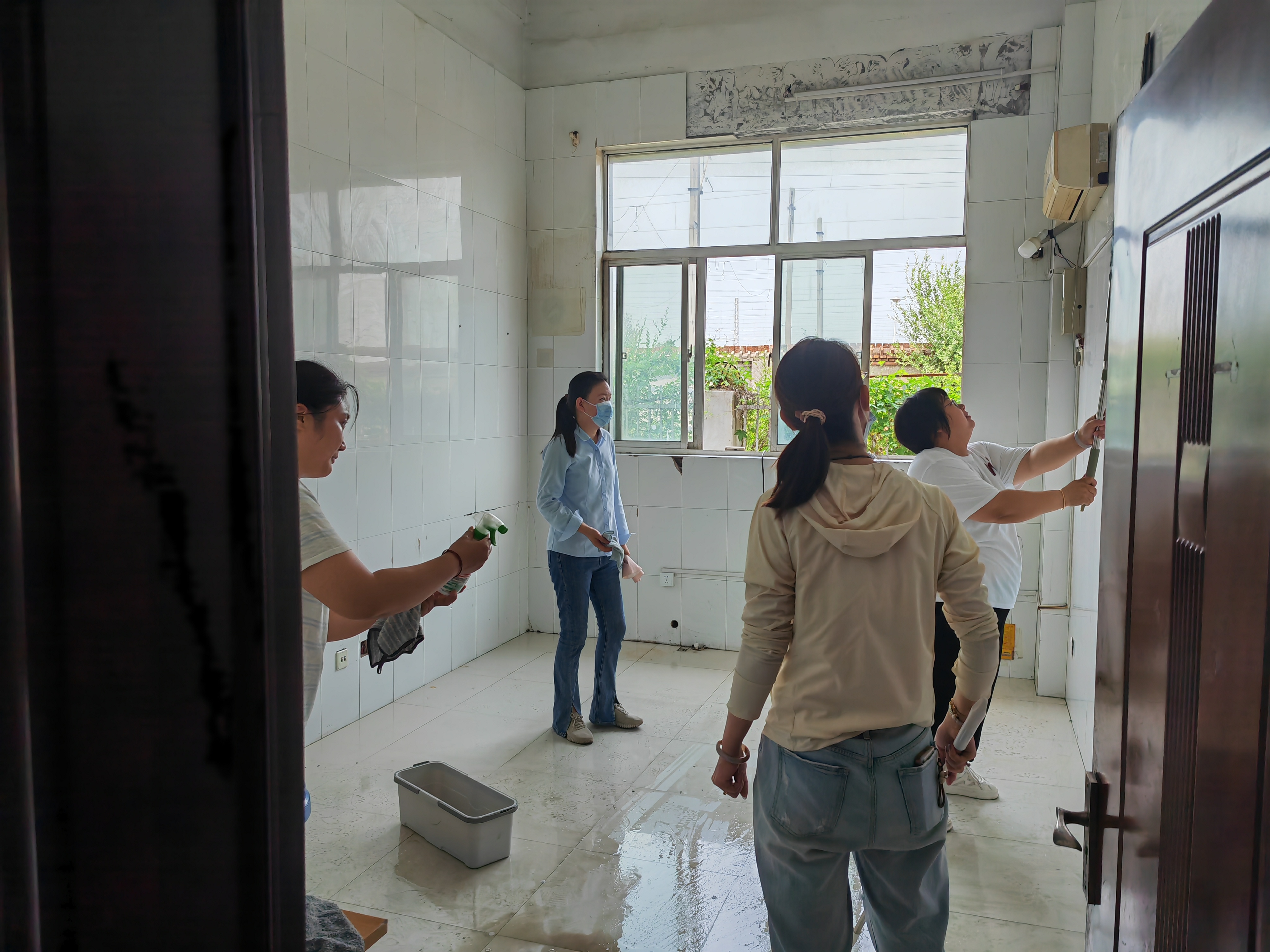 清理現(xiàn)場,大家干勁十足。管理人員們不放過任何一個衛(wèi)生死角,首先將堆積的廢棄物品徹底清空。隨后,按照“先掃后拖”的流程,對地面進(jìn)行深度清潔。床頭、床架縫隙這些容易積灰的角落,墻面瓷磚的每一處細(xì)節(jié),都被一一擦拭干凈。面對頑固污漬,大家更是拿出“繡花”功夫,使用洗潔精、“手榴彈”等專業(yè)清潔劑仔細(xì)處理。時值酷暑,室內(nèi)溫度高達(dá)30多度,汗水很快浸透了每個人的衣衫,豆大的汗珠順著臉頰不斷滑落……但沒有人叫苦叫累,大家心中只有一個目標(biāo):為駕駛員兄弟們創(chuàng)造一個更舒適的家。