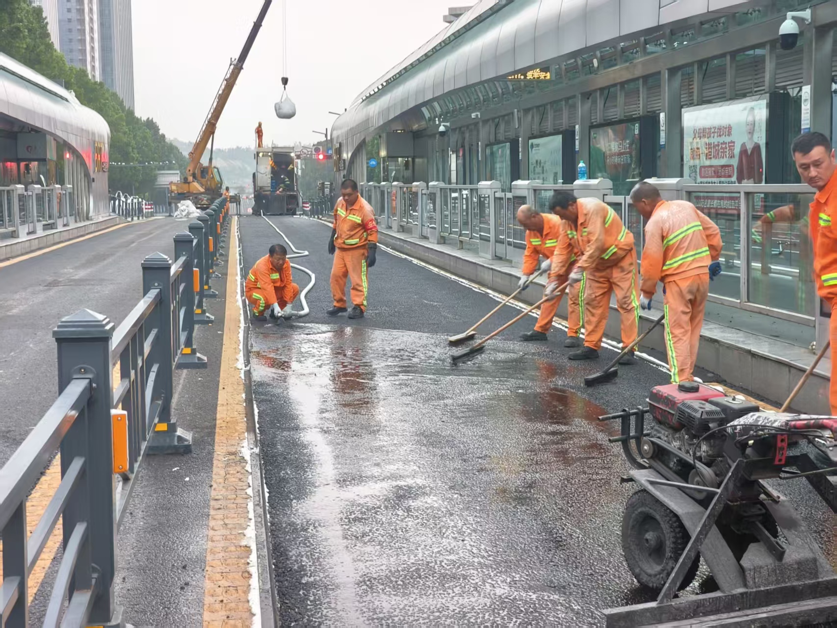 在港城BRT公交站臺專用車道養(yǎng)護(hù)項(xiàng)目中,董入龍創(chuàng)新工作室再次扛起“創(chuàng)新大旗”。公司管養(yǎng)的84個BRT公交站臺60米范圍專用車道,因客流量大、車輛??款l繁,路面車轍病害嚴(yán)重,傳統(tǒng)養(yǎng)護(hù)難以兼顧效率與質(zhì)量。工作室成員共同研判后,選取人流密集的一四九站、墟溝購物中心站及西園路站作為試點(diǎn),引入“灌注式半柔性路面技術(shù)”。為確保技術(shù)落地,董入龍帶領(lǐng)團(tuán)隊(duì)開展20余次模擬試驗(yàn),精準(zhǔn)把控材料攤鋪厚度、壓實(shí)溫度等核心參數(shù);施工期間,他創(chuàng)新采用“分段作業(yè) + 錯峰施工”模式,協(xié)調(diào)公交部門調(diào)整臨時??奎c(diǎn),最終僅用72小時便完成3個站臺專用車道的病害整治。經(jīng)后期跟蹤觀測,試點(diǎn)路段路面平整度、抗滑性能均達(dá)到優(yōu)質(zhì)標(biāo)準(zhǔn)。