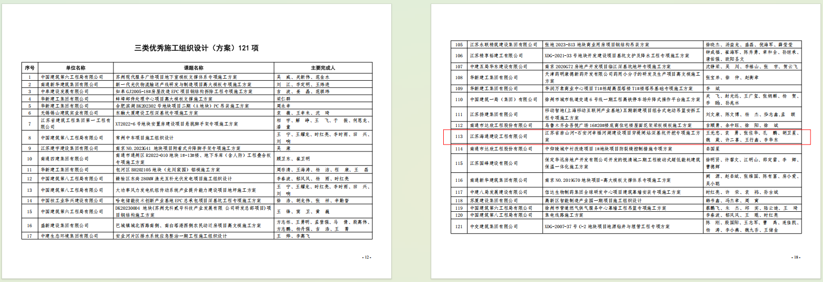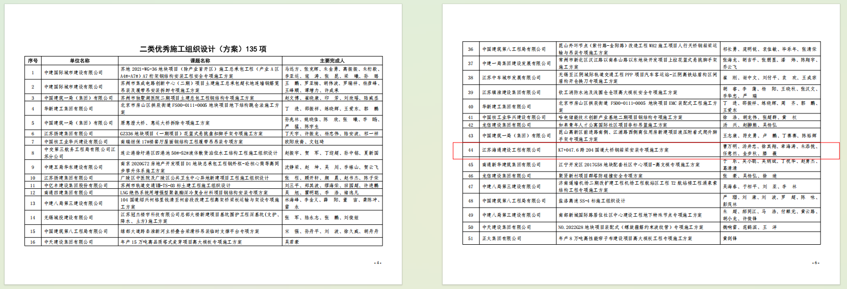 近日,江蘇省建筑行業(yè)協(xié)會正式發(fā)布2024年度江蘇省建筑業(yè)優(yōu)秀施工方案評價結(jié)果。海建公司申報的兩項施工方案榮獲表彰,其中《K7+047.6跨204國道大橋鋼箱梁安裝專項施工方案》獲評江蘇省建筑業(yè)二等優(yōu)秀施工方案,《穿堤閘站深基坑開挖專項施工方案》獲評三等優(yōu)秀施工方案。