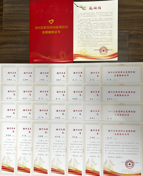 近日,物流集團28名志愿者收到來自海州區(qū)新冠肺炎疫情聯(lián)防聯(lián)控指揮部辦公室、幸福社區(qū)送來的志愿服務(wù)證書,對物流集團給予疫情防控志愿服務(wù)工作表示衷心感謝。