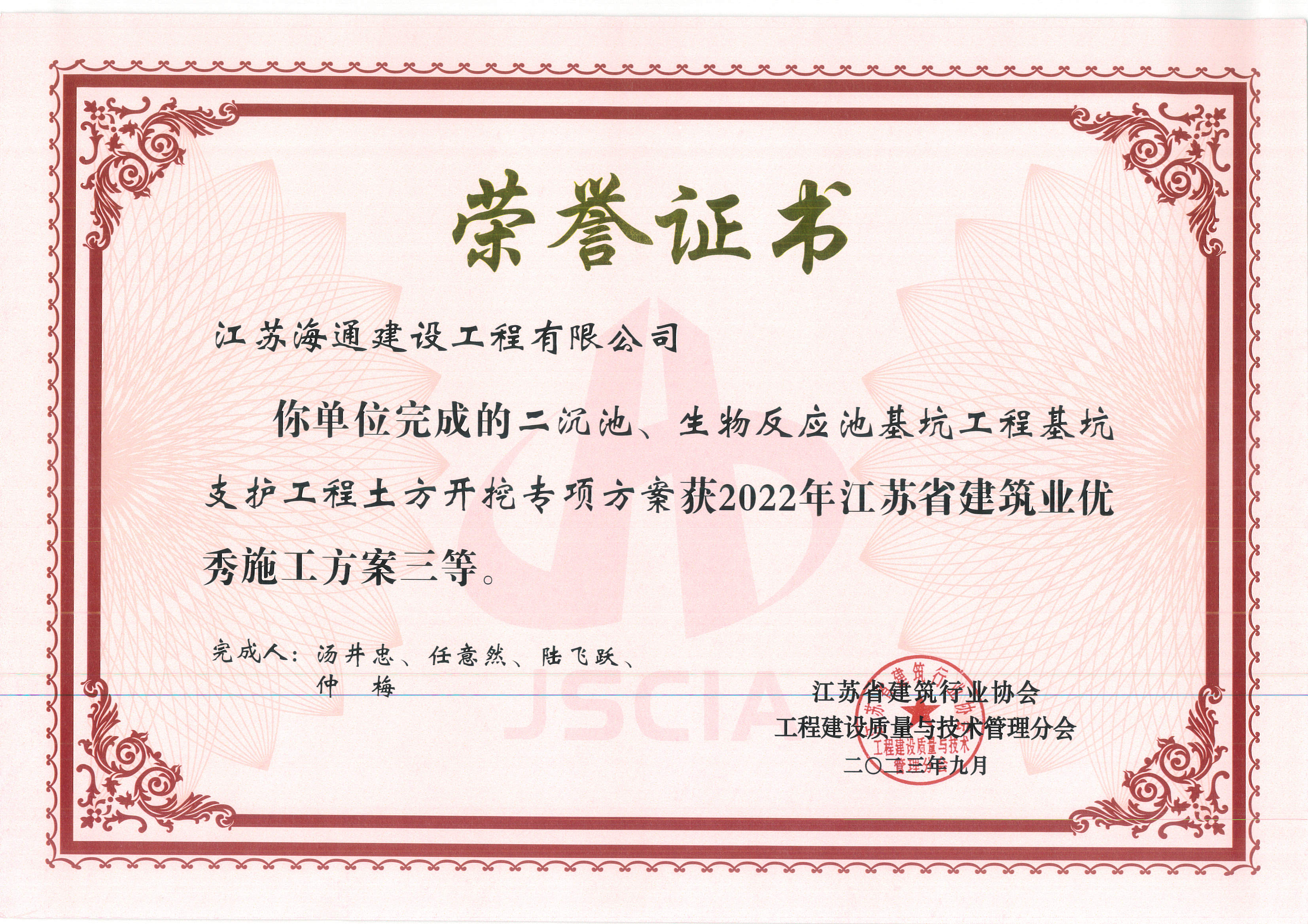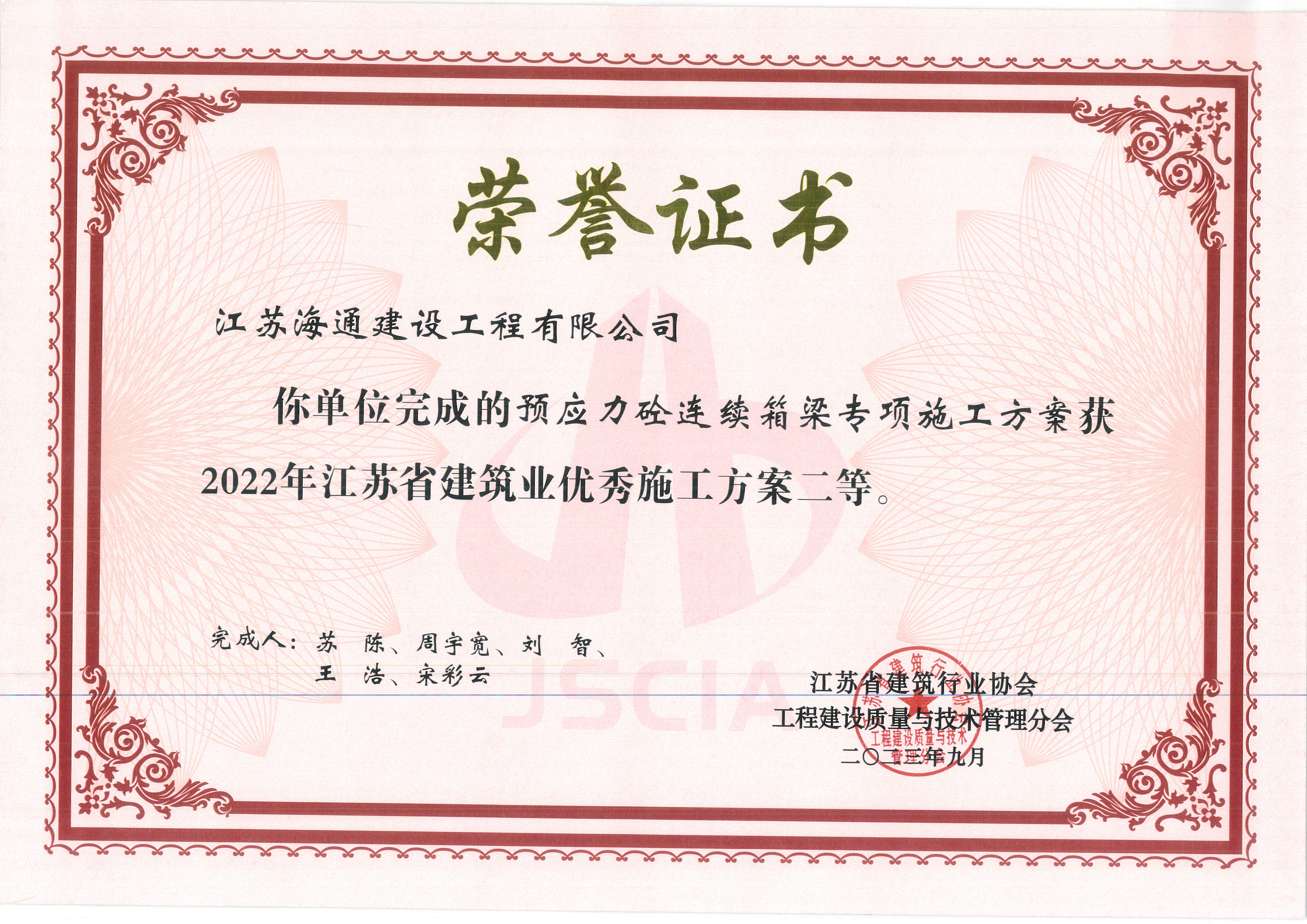 日前,從江蘇省建筑業(yè)協(xié)會獲悉,江蘇海建公司申報的《預應力砼連續(xù)箱梁專項施工方案》和《二沉池、生物反應池基坑工程基坑支護工程土方開挖專項方案》兩項施工方案分獲江蘇省建筑業(yè)優(yōu)秀施工方案二等獎和三等獎。