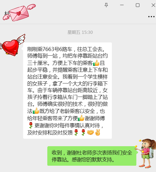 10月24日下午三點,市民杜老先生乘坐6路公交車前往市總工會時,被駕駛員武傳斌的細心服務(wù)深深打動。他特意發(fā)消息至公交集團權(quán)屬海通公交公司一名職工的手機上,稱贊道:“這位師傅開車特別穩(wěn),每到一站都會將車停得離站臺特別近,上下車方便又安全!”