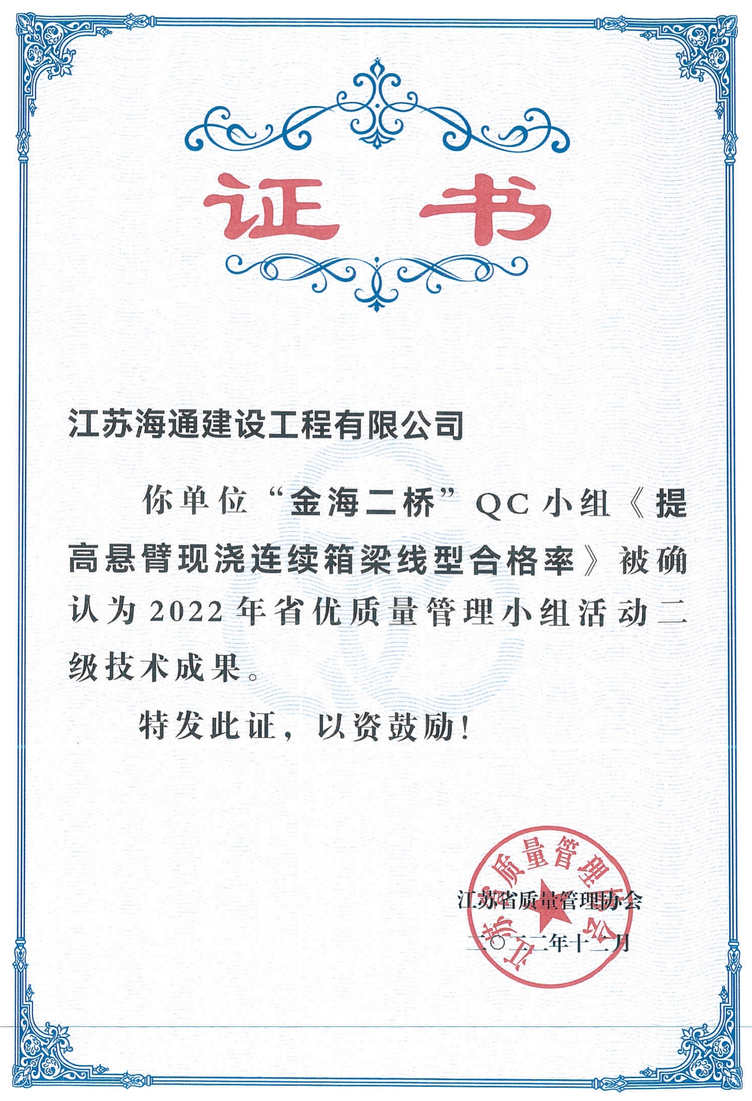 近日,從連云港市質(zhì)量協(xié)會獲悉,江蘇海建金海二橋QC小組成果《提高懸臂箱梁連續(xù)澆筑線型合格率》榮獲“2022年省優(yōu)質(zhì)量管理小組活動二級技術(shù)成果”,同時,金海二橋QC小組榮獲“2022年江蘇省優(yōu)秀質(zhì)量管理小組”。