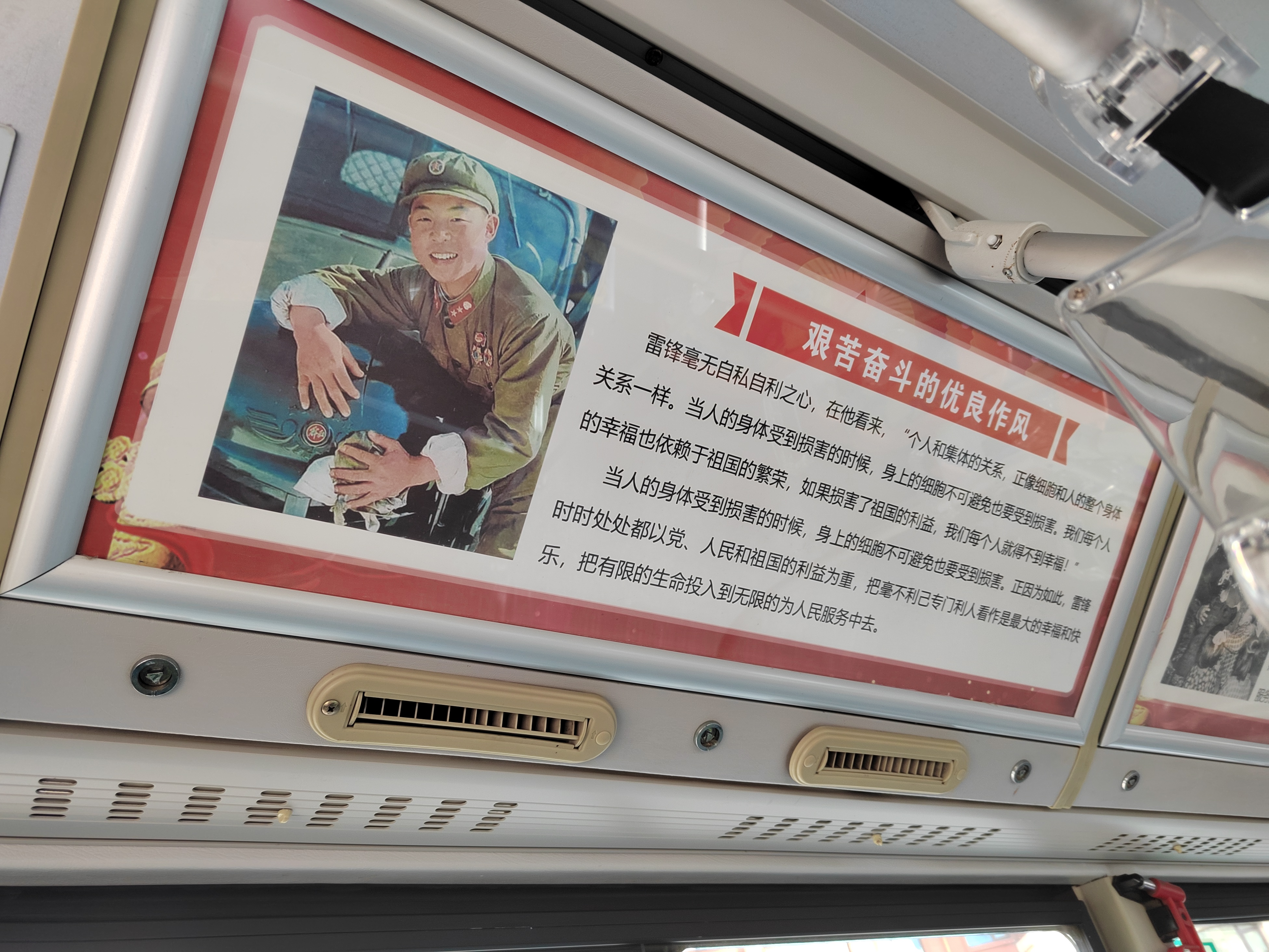 31路公交線全程22個(gè)站點(diǎn),途經(jīng)連云區(qū)主城區(qū)、海濱大道,道路情況復(fù)雜,上下坡道較多,乘客大多數(shù)為海濱大道周邊及連云古鎮(zhèn)居住的老年人。第60個(gè)學(xué)雷鋒紀(jì)念日即將到來(lái),公交集團(tuán)公交事業(yè)二部精心裝扮31路蘇GK8832公交車(chē)學(xué)雷鋒主題公交車(chē)。車(chē)廂外部以“學(xué)習(xí)雷鋒精神 弘揚(yáng)雷鋒精神 爭(zhēng)做時(shí)代先鋒”為主題詞;車(chē)廂內(nèi)部從“共產(chǎn)主義戰(zhàn)士 最美奮斗者”“艱苦奮斗的優(yōu)良作風(fēng)”“刻苦學(xué)習(xí)和鉆研理論”“干一行愛(ài)一行鉆一行”四大方面宣傳、介紹雷鋒先進(jìn)事跡,弘揚(yáng)雷鋒精神。乘客進(jìn)站臺(tái)前,便能遠(yuǎn)遠(yuǎn)地感受到濃厚的學(xué)雷鋒氛圍,感受到31路“與雷鋒車(chē)同行海濱大道文明線”車(chē)廂里積極向上的紅色底色。