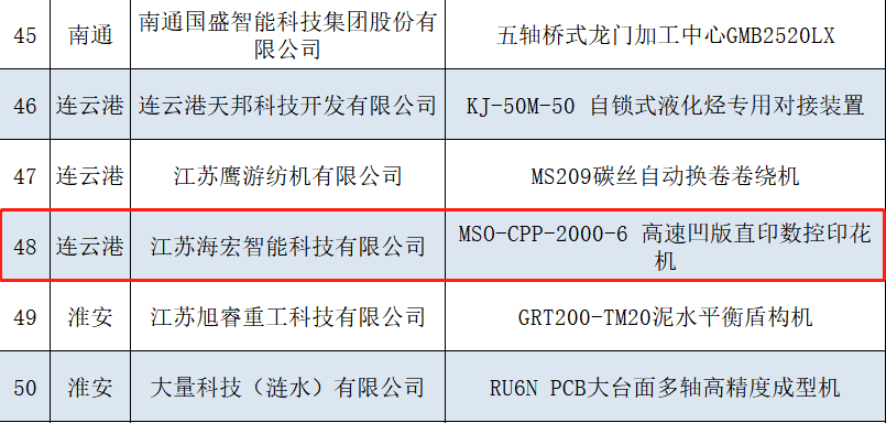 近日,江蘇省工業(yè)和信息化廳公示了2023年江蘇省首臺(套)重大裝備擬認定名單。市交通控股集團權(quán)屬江蘇海宏智能科技有限公司(以下簡稱海宏科技)的MSO-CPP-200-6高速凹版直印數(shù)控印花機在參評項目中脫穎而出,成功入選。
