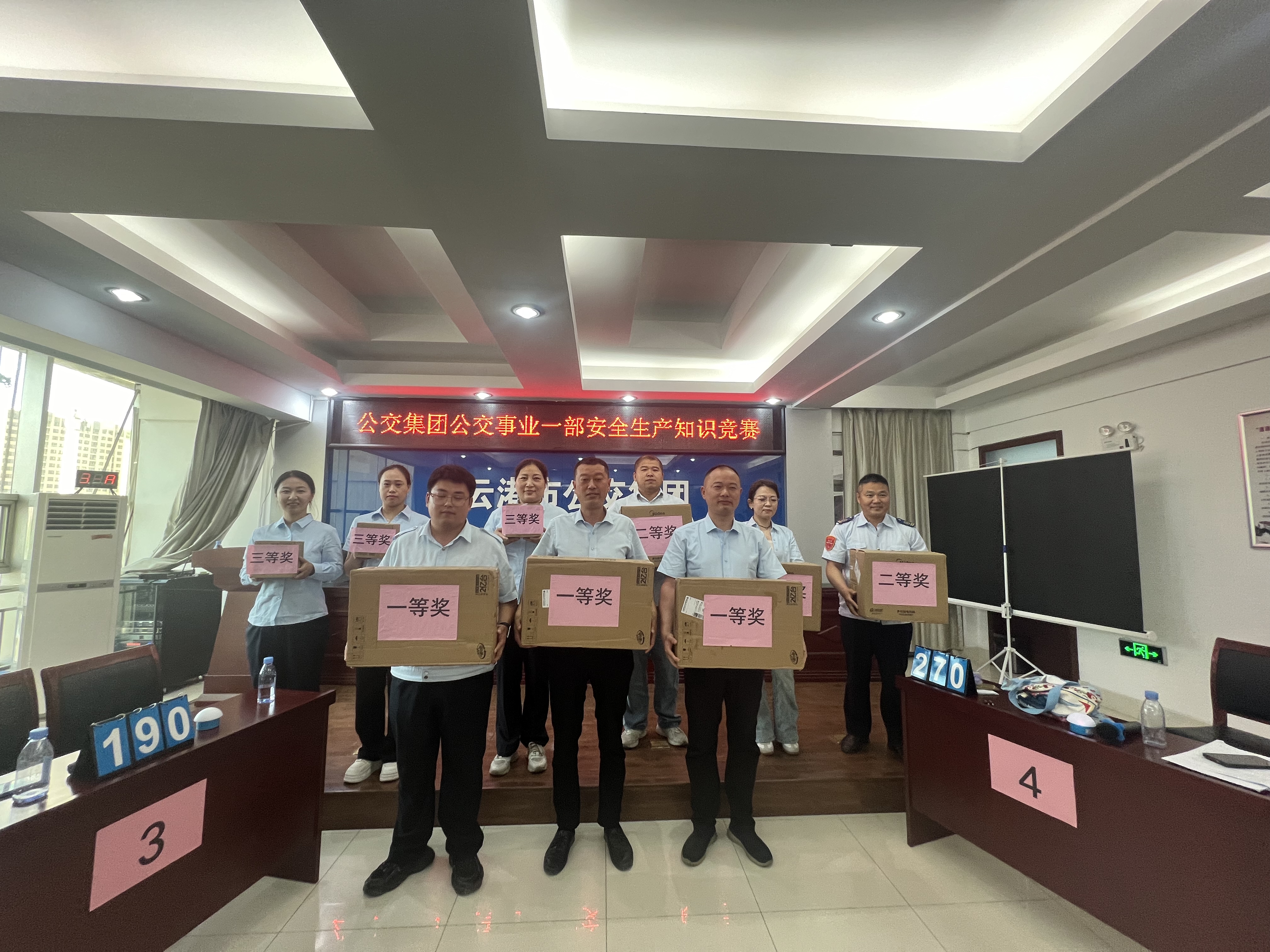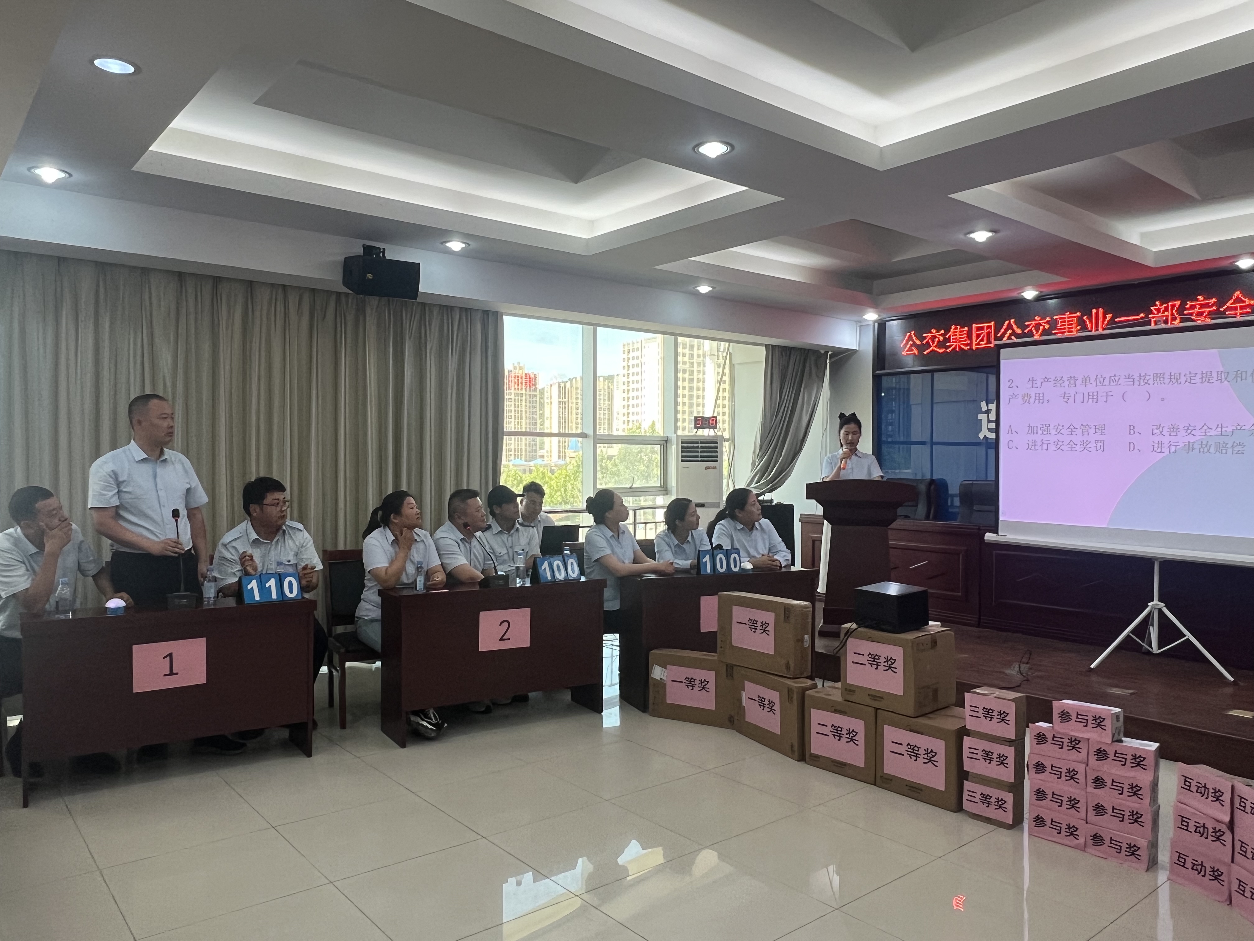 活動采用現(xiàn)場競賽答題的方式進行,設有必答題、搶答題、觀眾互動題、風險題及加賽題共5個環(huán)節(jié),主要檢驗選手們對安全生產(chǎn)知識的熟悉程度和踐行情況。各參賽隊在搶答環(huán)節(jié)中反應迅速,競相展現(xiàn)豐富的安全生產(chǎn)知識,選手的精彩表現(xiàn)贏得全場不斷的掌聲,掀起了整場比賽的熱潮?,F(xiàn)場觀眾互動答題亦反映公交人扎實的安全理論功底,答對即可領(lǐng)取獎品,還為相應參賽隊助力加分。最后,在一舉定乾坤的風險題環(huán)節(jié),讓選手和觀眾都經(jīng)歷了一次劇烈的頭腦風暴,經(jīng)過一番激烈的角逐,最終五公司獲得一等獎;二公司獲得二等獎;綜合辦獲得三等獎;一公司、三公司、綜合辦運營獲得參與獎。現(xiàn)場還進行了頒獎儀式,活動在熱烈的掌聲中圓滿落幕。