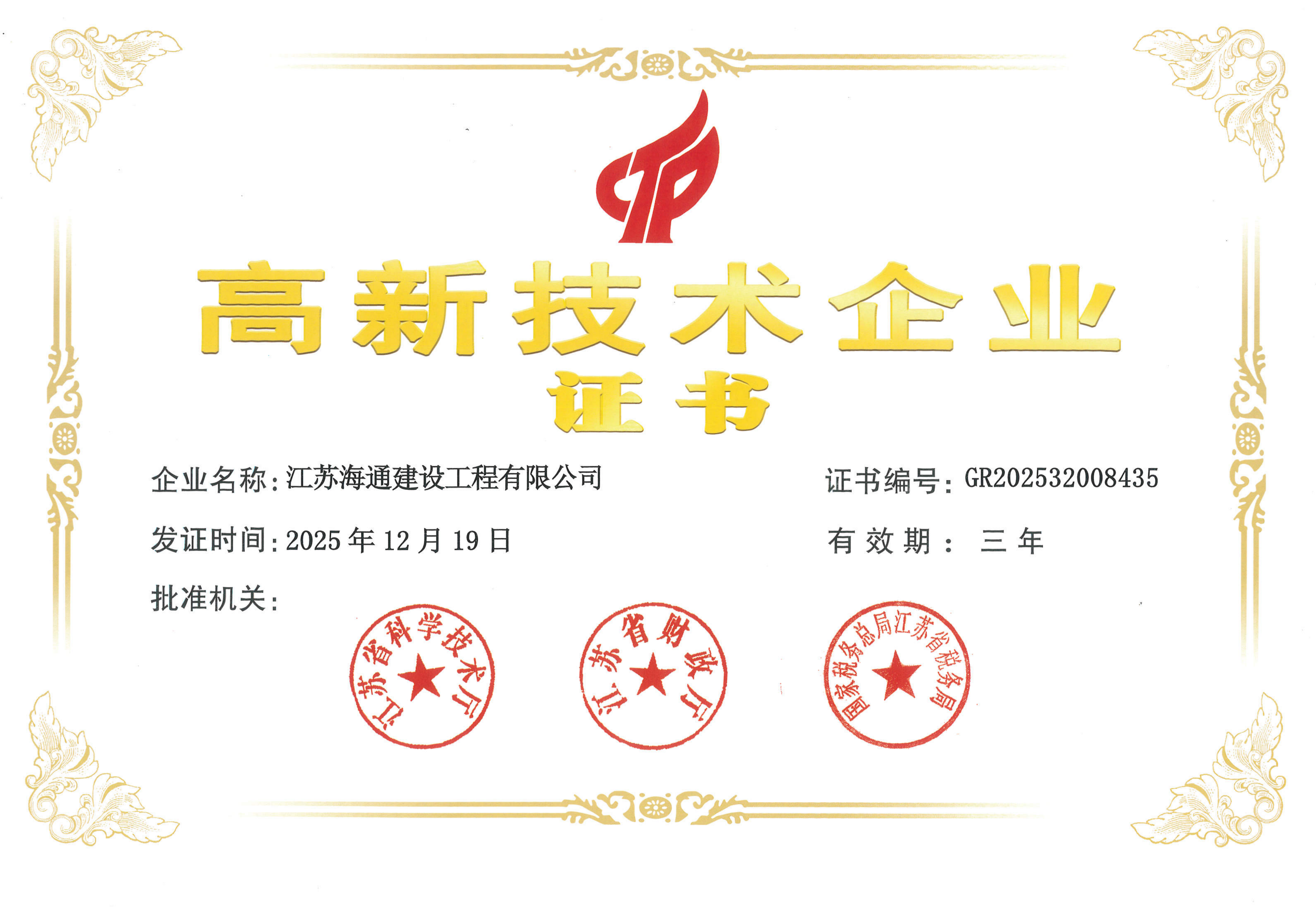 近日,從全國高新技術(shù)企業(yè)認(rèn)定管理工作領(lǐng)導(dǎo)小組辦公室傳來喜訊,海建公司順利通過國家高新技術(shù)企業(yè)認(rèn)定,正式榮獲由江蘇省科學(xué)技術(shù)廳、江蘇省財(cái)政廳、國家稅務(wù)總局江蘇省稅務(wù)局聯(lián)合頒發(fā)的“高新技術(shù)企業(yè)”證書。這標(biāo)志著海建公司在科技創(chuàng)新、技術(shù)研發(fā)與成果轉(zhuǎn)化領(lǐng)域的實(shí)力得到國家級(jí)權(quán)威認(rèn)可,正式躋身國家高新技術(shù)企業(yè)行列,為公司高質(zhì)量發(fā)展注入了強(qiáng)勁的科技動(dòng)力。